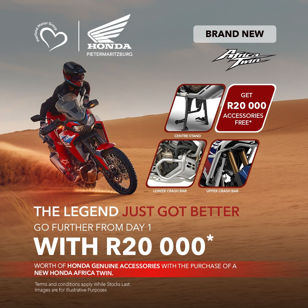 Go further from day 1 with R20 000 worth of Honda genuine accessories with the purchase of a new Honda Africa twin. |